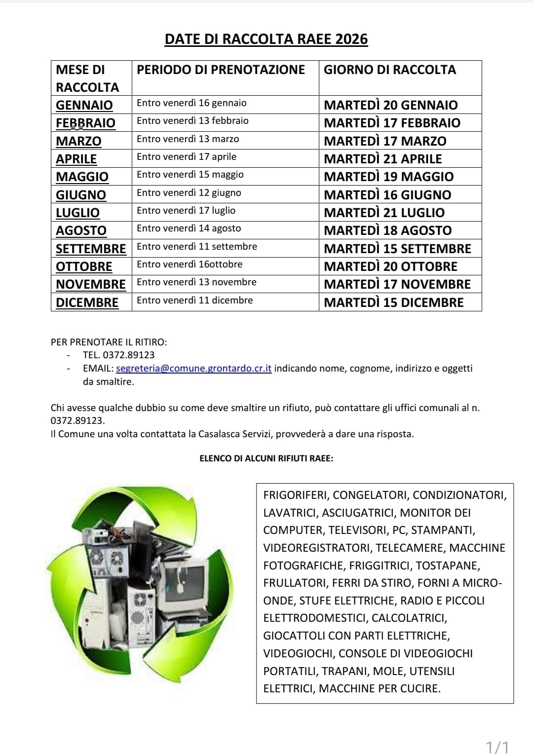 Per prenotare il ritiro è necessario telefonare al numero 0372 89123 oppure inviare un'email all'indirizzo segreteria@comune.grontardo.cr.it indicando: nome, cognome, indirizzo e oggetti da smaltire.